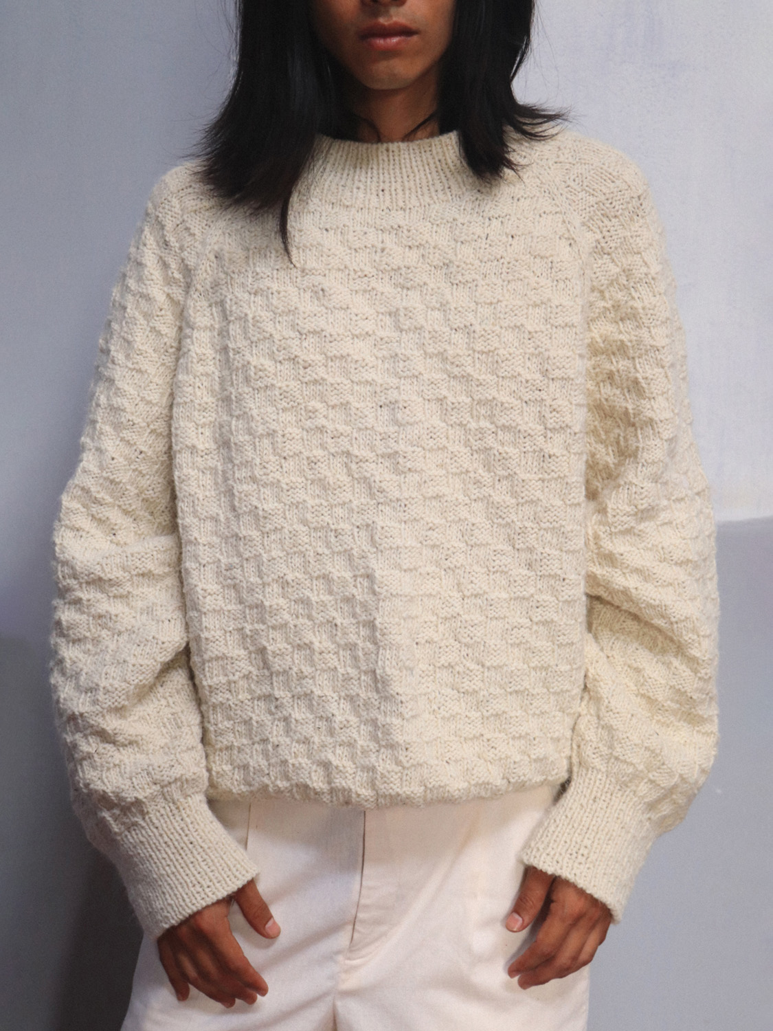 This wool comes from a small factory located in Huancayo, Junín, that obtains the raw material from remote family farms in those highlands. It remains in its natural color; was neither bleached nor dyed. It has a rustic feel that hasn’t been heavily processed by rows of machinery or toxic chemicals, but rather by an industrial and traditional process. That ensures that its manufacture is sustainable not only to the environment but also to the families involved from the ground up. Sometimes, in the finished garment you’ll find small remnants and pieces of twigs and dried plants, belonging to the farms; the beginning, which we intentionally leave because it talks about its roots.